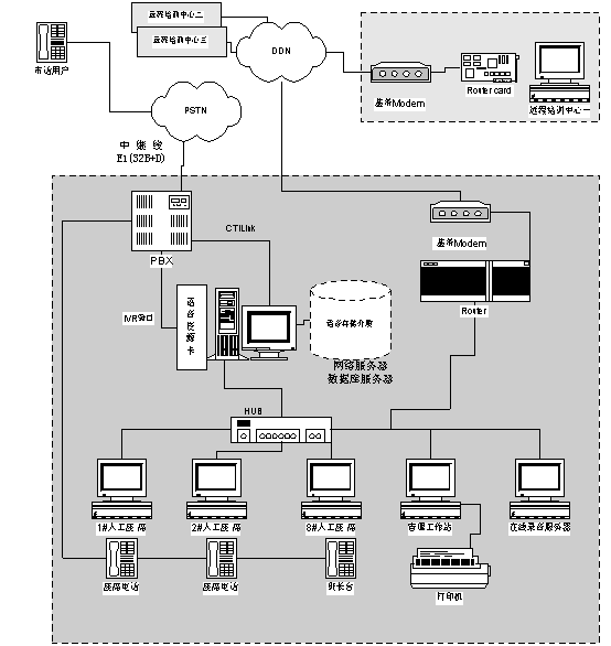 北京強訊恒通網(wǎng)絡技術公司通過利用該學院現(xiàn)有的計算機局域網(wǎng),根據(jù)該學院業(yè)務需求專門為800服務熱線設立了一組服務座席,每個座席都有座席電腦。所有撥打800熱線的電話通過CTI服務器的ACD系統(tǒng)分配到服務組最適合的座席。如該服務組暫時沒有空閑座席,則語音提示用戶等待并播放音樂,一旦有座席空閑則自動將該用戶電話轉(zhuǎn)接到空閑座席。當有外線進來接通到某個座席時,系統(tǒng)自動彈出該電話用戶的客戶資料。