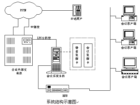 說明:如果沒有企業(yè)內(nèi)部程控交換機(jī)則可以將中繼線直接接在會(huì)議系統(tǒng)主機(jī)上,中繼線可以是普通模擬中繼,也可以是E1接口(如中國一號信令、30B+D等)。在與會(huì)議系統(tǒng)主機(jī)的同一網(wǎng)段上可以配置多個(gè)會(huì)議客戶端系統(tǒng),通過客戶端系統(tǒng)用戶可以隨時(shí)觀察和監(jiān)視會(huì)議系統(tǒng)的使用情況,并且可以建立常用用戶的用戶資料,也可以對常用用戶進(jìn)行分組,這樣要呼叫某些用戶開會(huì)時(shí)只需呼叫組用戶即可;