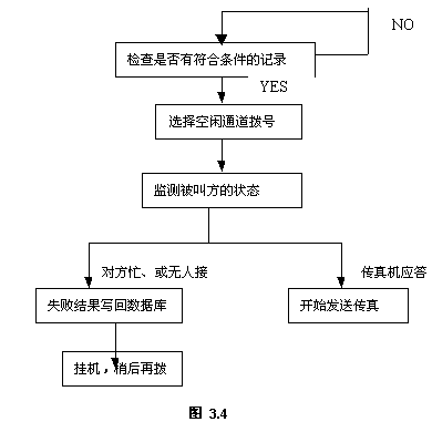 傳真發(fā)送功能是服務(wù)器后臺(tái)操作的,系統(tǒng)定時(shí)檢查傳真發(fā)送庫(kù),一旦有符合條件的記錄,自動(dòng)選擇空閑端口,按設(shè)定的傳真號(hào)碼撥號(hào),檢查被叫方的狀態(tài),若對(duì)方有傳真機(jī)應(yīng)答,則開始發(fā)送傳真;若對(duì)方忙、或無人接,系統(tǒng)稍后會(huì)再次試撥。若超過設(shè)定次數(shù)仍未發(fā)送成功,系統(tǒng)會(huì)通知發(fā)送人作其它處理。