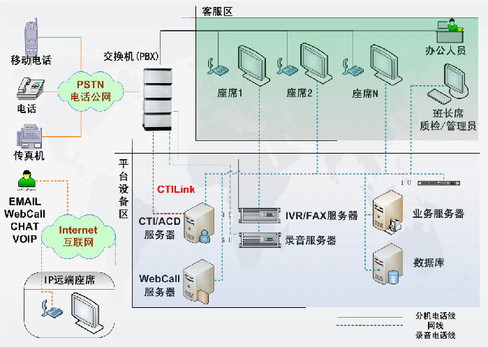 包含了PBX、CTI服務(wù)器、IVR/FAX服務(wù)器、錄音監(jiān)控 系統(tǒng)、報(bào)表統(tǒng)計(jì)系統(tǒng),CRM客戶管理等。