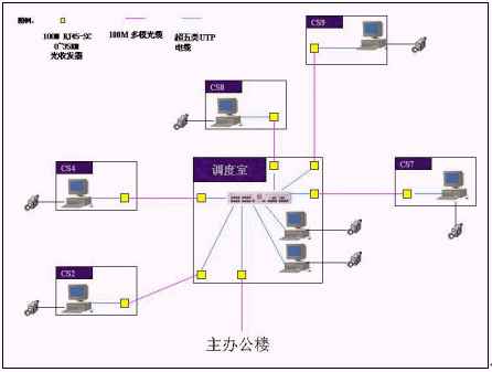 下例示圖是本產(chǎn)品的應(yīng)用實(shí)例。示圖中CS**和調(diào)度室均為現(xiàn)場(chǎng)操作人員工作的控制室。通過(guò)調(diào)度室同廠(chǎng)辦公樓實(shí)現(xiàn)網(wǎng)絡(luò)之間的互聯(lián)。每一臺(tái)信號(hào)處理服務(wù)器帶4到8個(gè)攝像頭,主辦公樓內(nèi)在現(xiàn)有的計(jì)算機(jī)上安裝了本公司的遠(yuǎn)程監(jiān)視軟件,實(shí)現(xiàn)了管理人員及廠(chǎng)領(lǐng)導(dǎo)的遠(yuǎn)程監(jiān)視的功能。