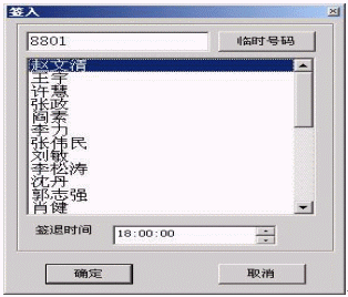 當公司外出員工回到單位以后,在公司前臺的訂席系統(tǒng)操作臺上按"簽入"鍵;屏幕上將顯示工位的分布及占用情況;按相應的工位后,屏幕將顯示輸入信息的菜單,輸入相應的信息后,按"確定"按鈕,如下圖: