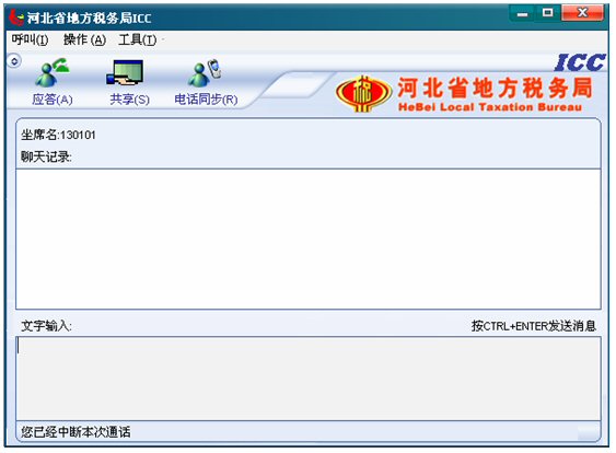 5. 點(diǎn)擊應(yīng)答按鈕后,應(yīng)答按鈕變?yōu)閽鞌喟粹o,并且左下角的狀態(tài)欄文字提示首先變?yōu)椤澳F(xiàn)在可以與對方進(jìn)行文本交談了”,從現(xiàn)在開始到坐席掛斷呼叫期間,坐席就可以和納稅人進(jìn)行文本交談了。