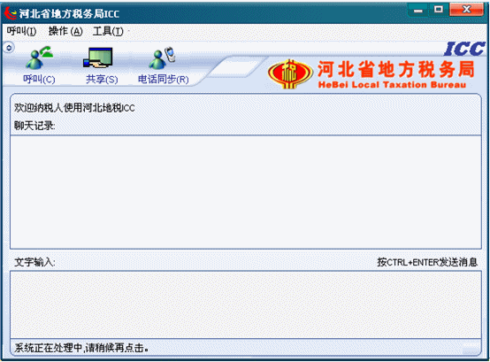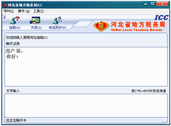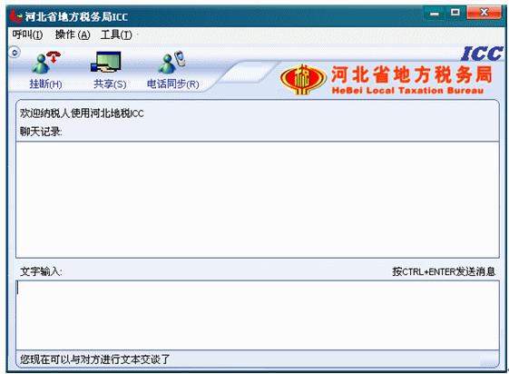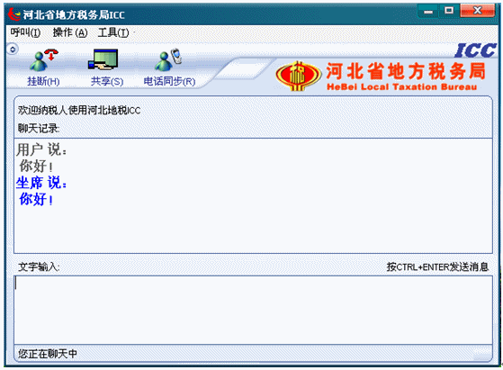 7.等待座席應(yīng)答后,左下角的狀態(tài)欄文字提示首先變?yōu)椤澳F(xiàn)在可以與對(duì)方進(jìn)行文本交談了”,從現(xiàn)在開始到納稅人掛斷呼叫期間,納稅人就可以和座席進(jìn)行文本交談了。