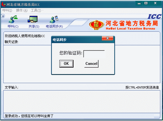 11.電話同步(一種直接呼叫指定座席的功能):如果納稅人先撥打12366,正在和河北省地市的某一座席通電話。此時(shí),納稅人需要此座席向納稅人提供ICC的幫助(文本交談和遠(yuǎn)程共享),納稅人就不能直接點(diǎn)擊呼叫按鈕,因?yàn)榧{稅人點(diǎn)擊呼叫按鈕系統(tǒng)將把納稅人的呼叫轉(zhuǎn)向納稅人呼叫地市的任意空閑座席,可能納稅人的呼叫就不能被轉(zhuǎn)到此時(shí)和納稅人通話的座席。準(zhǔn)備電話功能就能幫助納稅人直接呼叫到和納稅人通電話的座席。具體做法如下:通過電話,向和納稅人通電話的座席要一個(gè)驗(yàn)證碼,讓后點(diǎn)擊準(zhǔn)備電話按鈕,此時(shí)將出現(xiàn)一個(gè)“電話同步”的對(duì)話框,如下圖: