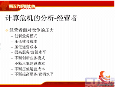 那么經(jīng)營(yíng)者的壓力就更大了,首先我要?jiǎng)?chuàng)新業(yè)務(wù)模式,我以前是做客戶服務(wù)的,現(xiàn)在我要掙錢,我要增加收入,我要做電話營(yíng)銷,壓低建設(shè)成本,壓低運(yùn)營(yíng)成本,這個(gè)是大家很容易理解的。同時(shí)他是不斷地創(chuàng)新業(yè)務(wù)模式,不斷地壓低建設(shè)成本,不斷地壓低運(yùn)營(yíng)成本,不斷地提高服務(wù)水平,這個(gè)不斷就給IT服務(wù)者傳遞了更大壓力。