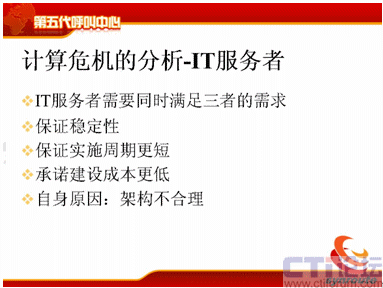 我分析一下計(jì)算的危機(jī),計(jì)算危機(jī)來(lái)源于三個(gè)方面,第一是客戶面對(duì)不斷提升的服務(wù)水平,現(xiàn)在需要新的通信方式,包括電話、傳真、短信、電子郵件等等,還包括網(wǎng)上的護(hù)航瀏覽,表單共享,電子排版等等通信方式。第二方面需要更快的服務(wù)時(shí)間,80%的電話是20秒接起,可是短信的響應(yīng)時(shí)間為什么這么長(zhǎng),需要更準(zhǔn)確的服務(wù),電話的服務(wù)是什么樣的,我現(xiàn)在需要網(wǎng)上交談的服務(wù)質(zhì)量也能夠得到保障等等,這是客戶對(duì)IT服務(wù)者提供的壓力。