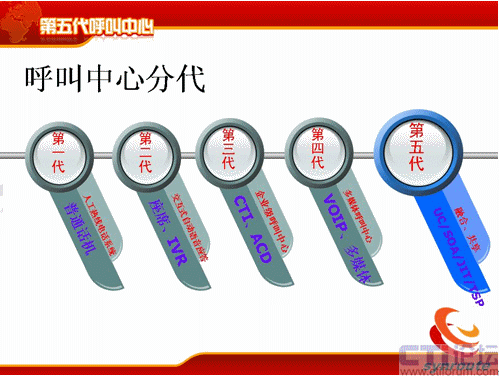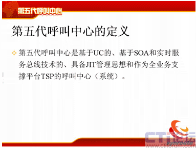 第五代呼叫中心的定義比較簡(jiǎn)單,第五代呼叫中心是基于UC的,基于SOA和實(shí)時(shí)服務(wù)總線技術(shù)的,具備JIT管理思想和作為全業(yè)務(wù)支撐平臺(tái)TSP的呼叫中心系統(tǒng)。