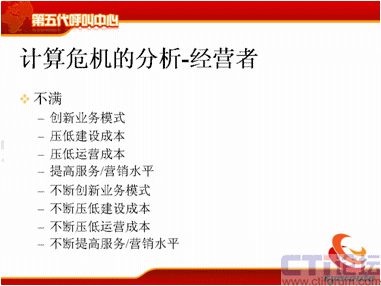計(jì)算危機(jī)的下一方面是運(yùn)營(yíng)管理者,可能在座很多人是做運(yùn)營(yíng)管理的,你們會(huì)不斷去跟IT服務(wù)者提需求,我下一個(gè)月想引進(jìn)新的聯(lián)絡(luò)方式,下個(gè)月我想引進(jìn)新的軟件,引進(jìn)新的流程,我想增加KPI指標(biāo),我想增加現(xiàn)場(chǎng)的管理手段,我想提高座席的工作效率,后面也是不斷的,不斷地去引入新的聯(lián)絡(luò)方式。