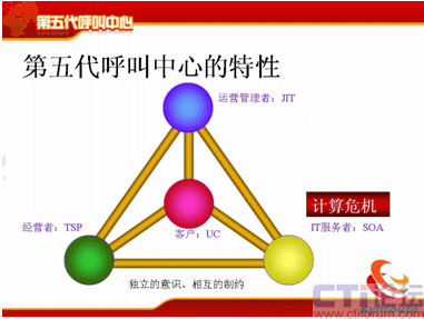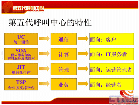 從分代上來(lái)講,和何總說(shuō)的稍微有點(diǎn)差異,但是基本上一樣的,第一代是人工熱線的電話系統(tǒng),時(shí)間點(diǎn)也差不多;第二代是有了座席IVR、自動(dòng)語(yǔ)音應(yīng)答這個(gè)特點(diǎn);第三代是有了CTI、ACD企業(yè)級(jí)的呼叫中心;第四代是互聯(lián)網(wǎng),有VOIP、多媒體等等這些多媒體的呼叫中心。那么第五代是什么?第五代的典型特征是融合共享,它是有四個(gè)特性,UC、SOA、JIT和TSP,這是五代的幾個(gè)主要特點(diǎn)。
