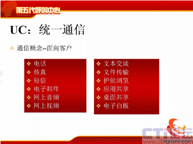那么這幾個(gè)特點(diǎn)稍微簡(jiǎn)單地說(shuō)一下,可能大家了解比較多了,從UC上來(lái)講,不管是現(xiàn)在國(guó)際上比較領(lǐng)先的通信廠商,CISCO、華為都在提UC的概念,軟件行業(yè)包括微軟。UC包括了通信的渠道,包括電話、傳真、短信、電子郵件、網(wǎng)上音頻、視頻,文本交談,文件傳輸、護(hù)航瀏覽、應(yīng)用共享、桌面共享等等,這是統(tǒng)一通信的部分。
