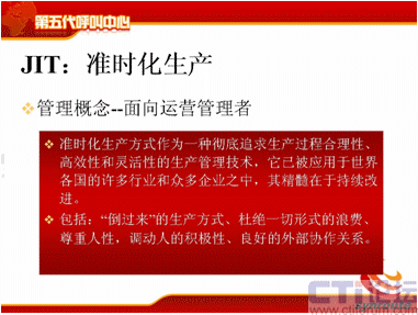 這四個(gè)特性是相輔相成的,首先在獨(dú)立方面,每一部分都有自己的特點(diǎn),適應(yīng)自己企業(yè)發(fā)展的需要,同時(shí)也是相互制約的。首先我說(shuō)這個(gè)獨(dú)立意識(shí),對(duì)于呼叫中心來(lái)說(shuō),從經(jīng)營(yíng)者的角度上,為什么要提TSP的概念呢?我們經(jīng)常遇到一個(gè)企業(yè)建立呼叫中心,是一個(gè)客戶服務(wù)中心,我們現(xiàn)在要做電話營(yíng)銷了,那好吧,我們就建一套電話營(yíng)銷系統(tǒng);這時(shí)候我們要做網(wǎng)絡(luò)方面的營(yíng)銷,好了,我們?cè)僮鲆粋(gè)網(wǎng)絡(luò)營(yíng)銷的呼叫中心,這是經(jīng)營(yíng)者現(xiàn)在意識(shí)亟待需要提高的。對(duì)于運(yùn)營(yíng)管理者來(lái)說(shuō),JIT思想,我剛才說(shuō)過(guò)它是一個(gè)核心的,它是一個(gè)不斷需要改進(jìn)流程的,改進(jìn)去優(yōu)化的,提出各種KPI指標(biāo)去優(yōu)化的,那么這個(gè)過(guò)程也是現(xiàn)在目前運(yùn)營(yíng)管理者一直比較薄弱的,需要一直提高的部分。