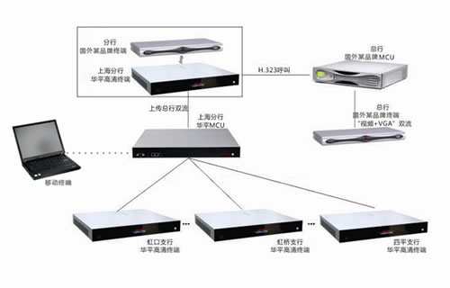 根據(jù)招商銀行的具體需求,以及原有視頻會(huì)議系統(tǒng)的現(xiàn)狀,華平股份以AVCON UCC統(tǒng)一協(xié)同通訊系統(tǒng)為平臺(tái),在上海分行實(shí)現(xiàn)與原有的國(guó)外品牌視頻會(huì)議系統(tǒng)實(shí)現(xiàn)硬件對(duì)接,并在支行部署華平CS2800高清終端實(shí)現(xiàn)支行與分行的連接,最終實(shí)現(xiàn)總行、分行、支行的三級(jí)視頻會(huì)議。