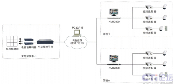 該部隊(duì)駐扎地為群島,擁有約70座附屬小島,計(jì)劃于總部所在地的主島布設(shè)10余個(gè)監(jiān)控點(diǎn),其它小島各設(shè)5個(gè)左右的監(jiān)控點(diǎn),監(jiān)控點(diǎn)位置主要為崗哨、山區(qū)坑道、微波發(fā)射站、軍需物資倉庫等處。目前主島和其中兩座小島的監(jiān)控系統(tǒng)已布建完畢,每個(gè)島配1臺(tái)NVR和5~10個(gè)前端,前端由視頻適配器和模擬攝像機(jī)、報(bào)警等外設(shè)組成。