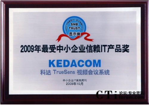 CTI論壇(ctiforum)11月23日消息(記者 潘婷):近日,在剛剛結(jié)束的“2009年最受中小企業(yè)信賴IT產(chǎn)品”評(píng)選活動(dòng)中,科達(dá)TrueSens(致勝)視頻會(huì)議系統(tǒng)憑借卓越的產(chǎn)品性能和良好的服務(wù)品質(zhì)在眾多IT產(chǎn)品中脫穎而出,獲此殊榮。