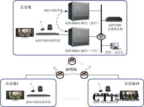 在充分了解用戶應(yīng)用需求的基礎(chǔ)上,2011年初科達(dá)為青島工商局規(guī)劃部署了一套高清視頻會(huì)議系統(tǒng)。其中,為了進(jìn)一步提升用戶的遠(yuǎn)程溝通體驗(yàn)和交互感,科達(dá)在市局主會(huì)場(chǎng)部署了1臺(tái)KDV7920高清視頻會(huì)議終端,在下屬14個(gè)分(市)局以及工商所分會(huì)場(chǎng)則各部署了1臺(tái)KDV7820高清視頻會(huì)議終端;而考慮到青島工商對(duì)于系統(tǒng)安全性、穩(wěn)定性方面的較高要求,科達(dá)則為其部署了 2臺(tái)KDV8000A多點(diǎn)控制單元(MCU)以實(shí)現(xiàn)雙機(jī)熱備;此外,系統(tǒng)還部署了KDV2000錄播服務(wù)器,以實(shí)現(xiàn)會(huì)議、培訓(xùn)過(guò)程的錄像和點(diǎn)播。整個(gè)系統(tǒng)通過(guò)工商局內(nèi)部的專網(wǎng)實(shí)現(xiàn)視音頻溝通和數(shù)據(jù)共享。