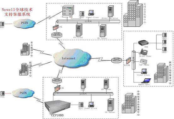 Novell中國技術(shù)支持中心采用融天科技的RT-CCP1000作為呼叫處理平臺,業(yè)務(wù)處理通過Internet用瀏覽器的方式使用美國現(xiàn)有的Siebel CRM業(yè)務(wù)系統(tǒng),作為Novell全球客戶服務(wù)支撐體系的一個分支,響應(yīng)來自全球的客戶服務(wù)。基于IP網(wǎng)絡(luò),系統(tǒng)設(shè)立了遠(yuǎn)端座席,為不同地區(qū)的用戶提供本地化、無差異化的服務(wù)。