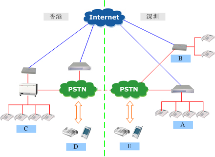 A點(diǎn)是深圳福田的office,B點(diǎn)是深圳蛇口的辦事處,C點(diǎn)是香港總部的office,D點(diǎn)香港本地電話和國(guó)際長(zhǎng)途,E點(diǎn)是深圳本地的電話用戶和國(guó)際長(zhǎng)途。