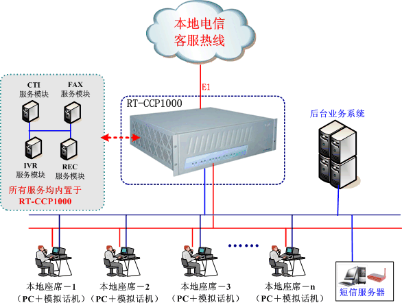 隨著RT-CCP1000呼叫中心系統(tǒng)的順利上線,徹底打破了申銀萬國以往的被動服務(wù)模式,將部分被動服務(wù)變主動服務(wù)模式同時,在融天科技的指導(dǎo)下,將外呼服務(wù)、傳真服務(wù)、留言信箱、短信功能以及外呼模塊有效的結(jié)合起來,同時整合申銀萬國的各項(xiàng)資源進(jìn)行了客戶資源挖掘,為申銀萬國產(chǎn)生了巨大的商業(yè)價值,RT-CCP1000呼叫中心系統(tǒng)從為客戶提供服務(wù)變?yōu)榱酥苯赢a(chǎn)生利潤呼叫中心系統(tǒng),目前已經(jīng)被申銀萬國當(dāng)作了業(yè)務(wù)轉(zhuǎn)型、創(chuàng)新亮點(diǎn)、爭奪客戶資源、體現(xiàn)企業(yè)實(shí)力的重要手段。統(tǒng)組網(wǎng)大致如下: