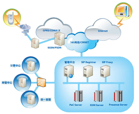 POC(Push-to-talk Over Cellular)是基于蜂窩移動(dòng)通信網(wǎng)絡(luò)的PTT(Push To Talk)業(yè)務(wù)。POC通過(guò)半雙工VoIP技術(shù)來(lái)實(shí)現(xiàn)PTT,利用GPRS或CDMA1X等網(wǎng)絡(luò)“永遠(yuǎn)在線”的優(yōu)勢(shì),節(jié)省運(yùn)營(yíng)成本,同時(shí)為傳統(tǒng)移動(dòng)用戶提供全新的業(yè)務(wù)形式。在支持GPRS/CDMA1X網(wǎng)絡(luò)的同時(shí),東信北郵手機(jī)一鍵通平臺(tái)系統(tǒng)亦支持IMS網(wǎng)絡(luò)。