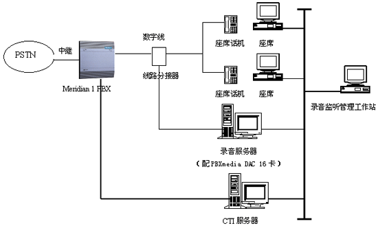使用Music Telecom PBXmedia DAC 16線數(shù)字PBX錄音監(jiān)聽(tīng)接口卡,直接與北電Meridian 1交換機(jī)的數(shù)字用戶線的分接線連接,實(shí)現(xiàn)并線錄音。其物理結(jié)構(gòu)如下所示: