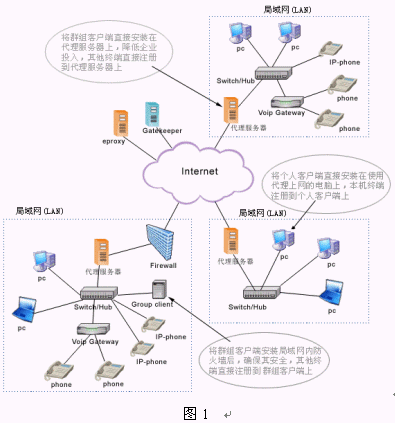 該系統(tǒng)建立在NGN基礎(chǔ)上,包括交換中心Asiasoft Gatekeeper,解決NAT、防火墻的代理軟件eProxy和視頻多點(diǎn)控制單元MCU,這些都建立在ITU制定的標(biāo)準(zhǔn)H.323協(xié)議上。一般單位和企業(yè)為便于管理和應(yīng)用,都建設(shè)了使用私有IP 地址的局域網(wǎng)(LAN),當(dāng)需要訪問外網(wǎng)時必須進(jìn)行地址轉(zhuǎn)換(NAT)。局域網(wǎng)內(nèi)的終端之間進(jìn)行呼叫和通信時沒有任何問題,但與外網(wǎng)終端進(jìn)行VoIP通信時就會有問題產(chǎn)生,原因是局域網(wǎng)中的IP地址是私有的,在Internet中不可路由。為了解決VoIP通信協(xié)議不能穿越防火墻和NAT的問題,亞軟軟件技術(shù)股份有限公司推出了eProxy代理軟件。它可以在確保網(wǎng)絡(luò)安全、不改變已有設(shè)備和網(wǎng)絡(luò)環(huán)境的情況下,為用戶實(shí)現(xiàn)實(shí)時的點(diǎn)對點(diǎn)IP語音、視頻和數(shù)據(jù)通信服務(wù)。(如圖1所示)