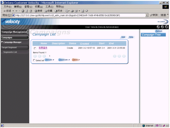易虹德龍(Delano),所提供的Custoemr Velocity滿足了CRM用戶在電子營銷方面的需求。在這個(gè)平臺(tái)上,CRM系統(tǒng)用戶,可以通過WEB界面,輕松地針對(duì)客戶分組制定和管理所有市場活動(dòng)。這些市場活動(dòng),通過多個(gè)步驟一步一步地抓住客戶的“心”。下圖是使用易虹解決方案進(jìn)行活動(dòng)管理的界面: