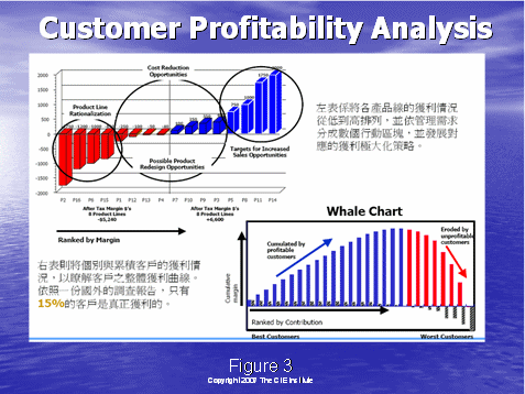 圖3右下角的鯨狀圖進一步地說明了情況:它根據客戶分配成本,而更清楚地看到客戶收益性。行動成本計算或ABC可以使確保您的業(yè)務實現贏利的關鍵成本更清楚易懂。讓我們看一個例子,來比較兩種獲得和保持手機用戶的不同的方法。你將看到該高水平分析法可以很充分地使對呼叫中心利潤的基本要素有更深的理解。
