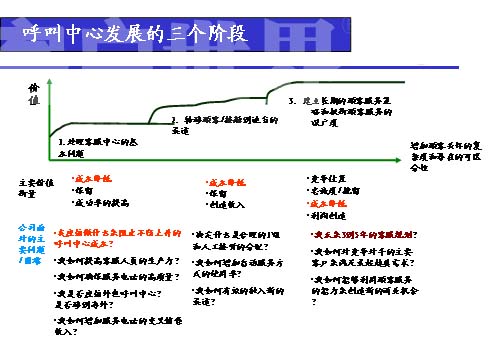 這個(gè)圖顯示的是呼叫中心的發(fā)展,我也把主要的東西說(shuō)一下。呼叫中心有一個(gè)階段性的發(fā)展,從我們這個(gè)圖形上看呼叫中心它所呈現(xiàn)的價(jià)值層面,體現(xiàn)了復(fù)雜度,這個(gè)是增加顧客關(guān)懷的復(fù)雜度,這個(gè)是可區(qū)分的,它有三個(gè)階段。