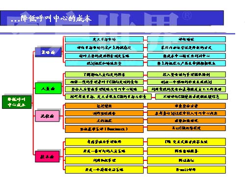 呼叫中心的成本降低從策略面、人員面、流程面、技術(shù)面、財(cái)務(wù)面。財(cái)務(wù)面有一些方法,這個(gè)是做外包的呼叫中心最重要的方法,外包面最主要的是合同怎么簽訂,決定了你是不是很好的降低你的成本。我直接說(shuō),在國(guó)內(nèi)簽的合同都沒(méi)有直接降低成本,因?yàn)槭前凑展潭ǖ娜嘶蛘呤枪潭ǖ淖鶛C(jī)收費(fèi),用10個(gè)人我可以完成的我用20個(gè)人,因?yàn)?0個(gè)人可以多收錢。所以,沒(méi)有動(dòng)力去降低成本。為什么呼叫中心不能改進(jìn)它,因?yàn)楹贤拗苾煞,如何能夠讓我的成本降低,讓我的利?rùn)提高,讓我的客戶滿足度增加,增加的部分我們共享,我拼命降低成本,因?yàn)槌杀驹降湾X賺得更多。比如說(shuō)按照通話時(shí)間來(lái)說(shuō),這種合同限制你的效率提高,以后大部分是自建的,不見得考慮這個(gè)問(wèn)題。