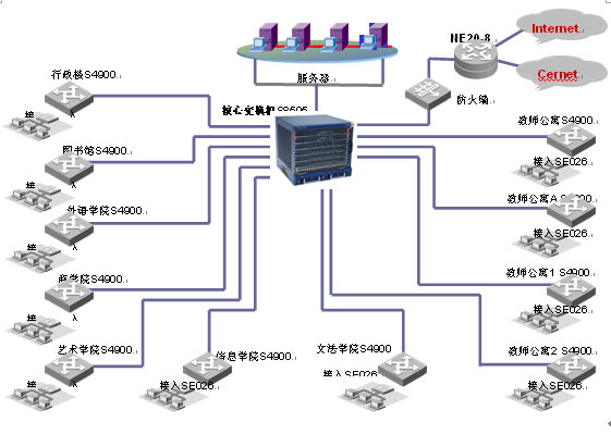 S8505萬兆核心路由交換機(jī)作為整個(gè)網(wǎng)絡(luò)的核心,以高密度、大容量的轉(zhuǎn)發(fā)性能為豐富的業(yè)務(wù)提供支持。Quidway? S8505萬兆核心路由交換機(jī)具備178Mpps的處理能力,300G的交換容量,并可以升級到600G;接入采用為教育行業(yè)定制的E026/E050交換機(jī),實(shí)現(xiàn)整網(wǎng)的安全接入的完善的帶寬管理功能。網(wǎng)絡(luò)出口采用NE20-8第五代路由器實(shí)現(xiàn)雙出口,實(shí)現(xiàn)靈活的路由策略。