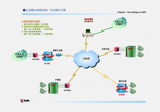 此方案實(shí)施后,用戶今后的VoIP分點(diǎn)擴(kuò)容會(huì)十分簡單易行。當(dāng)用戶有新的分店時(shí),分店的通訊系統(tǒng)可以直接上一臺(tái)Polylink eTalk® IA系列i PBX,它既有與PBX相同而且更多的各種功能,還具有VOIP網(wǎng)關(guān)的功能,可直接與總部的IX系統(tǒng)互相注冊,既省掉了多添置一臺(tái)語音網(wǎng)關(guān)的成本,也避免了設(shè)備的重復(fù)堆壘。