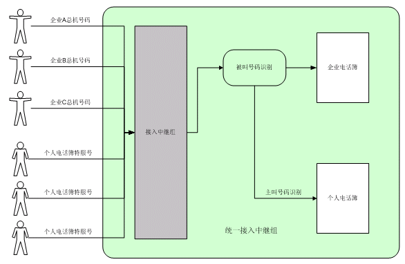 企業(yè)電話簿呼叫中,系統(tǒng)將根據(jù)被叫號碼判別進(jìn)入相應(yīng)的企業(yè)電話簿,提供相應(yīng)的集團(tuán)總機(jī)服務(wù)。如需在同一組接入中繼中同時提供企業(yè)電話簿業(yè)務(wù)和個人電話簿業(yè)務(wù),則系統(tǒng)將首先進(jìn)行被叫號碼鑒別。若存在與被叫號碼相對應(yīng)的企業(yè)電話簿,則提供企業(yè)電話簿服務(wù);否則,進(jìn)行主叫號碼鑒別,判斷是否提供個人電話簿服務(wù)。