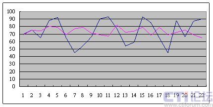 這是兩個呼叫中心從早上8點開始,一直到晚上6點,每隔半個小時的服務(wù)水平?梢院芮宄目吹,藍色這條線,它服務(wù)水平在91到48這中間震蕩,平均服務(wù)水平是73左右,粉紅色這條線,雖然平均服務(wù)水平也是在73左右,但震蕩幅度卻小了很多,服務(wù)水平只在81到68這中間震蕩。