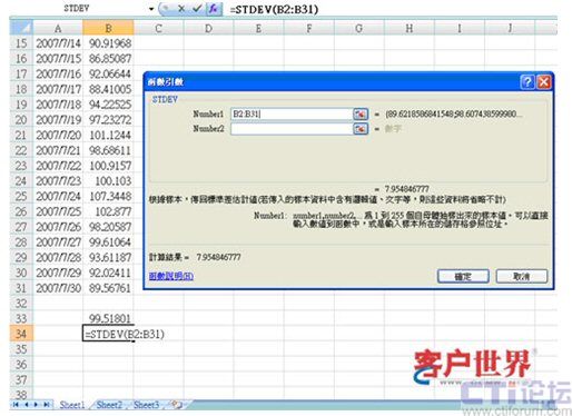 標準差計算方法很簡單,在EXCEL里面,只要利用“STDEV”函數(shù),選中你要計算標準差的數(shù)列,如下圖,我們要計算7月1號到30號平均處理時長的標準差,7月1號到30號平均處理時長的數(shù)據(jù),就是B2到B31這數(shù)列,只要選中這數(shù)列,按“確定”,就會得出標準差。
