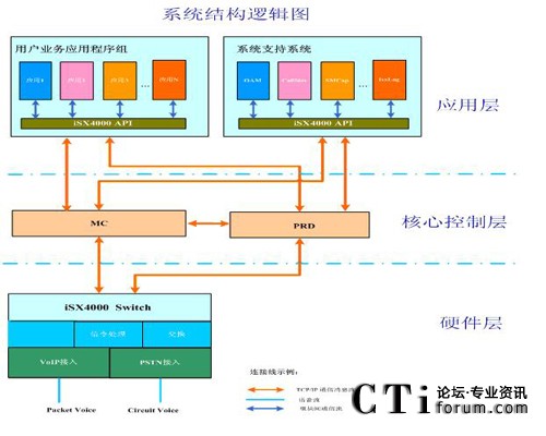 MC是整個(gè)的系統(tǒng)控制核心,其完成對(duì)iSX4000 交換機(jī)的所有控制功能,包括系統(tǒng)配置管理、呼叫控制、媒體網(wǎng)關(guān)控制和媒體資源管理等。應(yīng)用層的業(yè)務(wù)應(yīng)用程序發(fā)起的所有控制命令,通過(guò)MC路由到指定的iSX4000交換機(jī)上,并由iSX4000交換機(jī)最終完成指定的操作,而操作的結(jié)果最終通過(guò)MC,返回給業(yè)務(wù)應(yīng)用程序。同理,由iSX4000交換機(jī)發(fā)起的控制信號(hào),亦是通過(guò)MC來(lái)派發(fā)給特定的業(yè)務(wù)應(yīng)用程序,業(yè)務(wù)應(yīng)用程序處理后,通過(guò)MC反饋給iSX4000交換機(jī)。