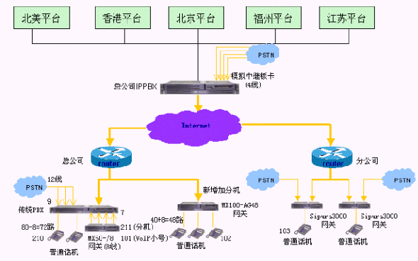 保留南京總公司原有傳統(tǒng)的集團電話交換機,電話號碼固定。需要通過PSTN外線撥打當?shù)氐氖性,還可以撥打VoIP網(wǎng)絡(luò)電話。