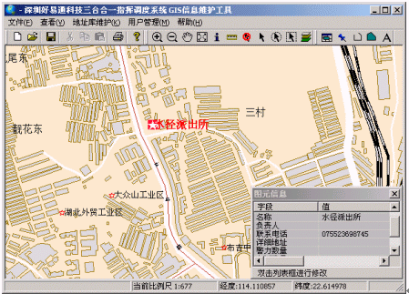 好易通三臺合一指揮調(diào)度警用地理信息子系統(tǒng)是好易通三臺合一指揮調(diào)度系統(tǒng)的一個重要組成部分,主要參考《警用地理信息系統(tǒng)建設(shè)規(guī)范》以及公安部《縣、市級公安機(jī)關(guān)"三臺合一"接處警系統(tǒng)技術(shù)規(guī)范》設(shè)計,基于MapInfo平臺開發(fā),接處警人員可運用該子系統(tǒng)對案發(fā)地點進(jìn)行多中定位(模糊定位、輔助定位),多種查詢及多種調(diào)度。