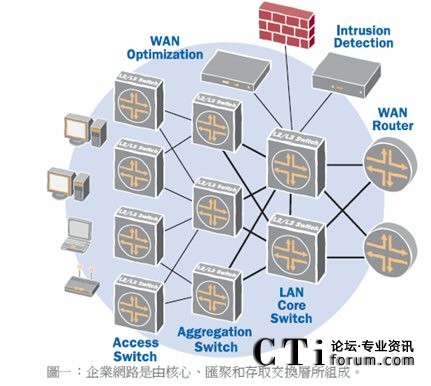 復(fù)雜的網(wǎng)絡(luò)拓?fù)?/b>:網(wǎng)絡(luò)架構(gòu)因內(nèi)含龐雜的多層網(wǎng)絡(luò),而變得越來越復(fù)雜。目前多數(shù)企業(yè)網(wǎng)絡(luò)都是三層式拓?fù),包括?shù)據(jù)匯聚層或分發(fā)層。許多網(wǎng)絡(luò)都已部署了匯聚交換機(jī),以彌補(bǔ)傳統(tǒng)存取及核心交換機(jī)欠缺高速光纖接口的缺陷,以便支持直接的連接。有些企業(yè)甚至建立了第四層網(wǎng)絡(luò),由連接到核心交換機(jī)的核心路由器組成。這樣的網(wǎng)絡(luò)架構(gòu)雖然可以發(fā)揮一定的作用,但卻大幅增加了資本支出,造成操作流程過于復(fù)雜,并為管理帶來沉重負(fù)擔(dān)。此外,這類架構(gòu)也會(huì)增加網(wǎng)絡(luò)的等待時(shí)間,并導(dǎo)致超額負(fù)載的情況出現(xiàn),因而降低了應(yīng)用效能。