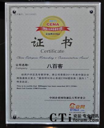 CTI論壇(ctiforum)10月31日消息(記者 張潔):10月19日,2011 秋季CENCE 中國企業(yè)網(wǎng)絡(luò)通信大會暨云計算高峰論壇在上海展覽中心盛大舉行。國內(nèi)首家SaaS廠商八百客憑借連續(xù)在云計算領(lǐng)域的成熟技術(shù)以及在市場中的廣泛認(rèn)可度,獲得“最佳呼叫中心系統(tǒng)CRM提供商”大獎。