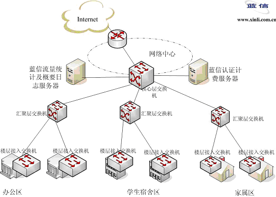 在網(wǎng)絡中心機房部署“藍信認證計費系統(tǒng)”,藍信認證計費系統(tǒng)除支持標準的RADIUS協(xié)議外,還支持領先的802.1x協(xié)議,通過與各接入層交換機的配合,實現(xiàn)了認證管理功能。通過綁定帳號、IP、MAC地址等15元素,真正保證只有合法用戶才能通過認證;對用戶進行分級權(quán)限管理,可按信用度等級對用戶進行劃分,方便了用戶的管理。此外,在網(wǎng)絡出口處部署藍信流量統(tǒng)計工具,通過與藍信認證計費系統(tǒng)的配合,實現(xiàn)對用戶按流量來計費,可以把用戶訪問流量按校內(nèi)校外、國內(nèi)國際來區(qū)別對待,并設置不同的費率。同時,還部署了藍信概要日志系統(tǒng),有效記錄了用戶的上網(wǎng)信息,并提供人性化的web客戶端,方便管理者進行事后查詢,有效的控制了網(wǎng)絡的安全性。