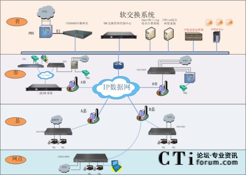 IP電話系統(tǒng)項目方案設(shè)計共分省、地州市、縣(市)三級進行部署,按照省集團至地州市分集團、縣(市)級分集團及營業(yè)廳建設(shè),全網(wǎng)通過部署相應(yīng)的IP電話設(shè)備(含語音軟交換、接入網(wǎng)關(guān)、PC軟電話、網(wǎng)管軟件、計費軟件等),組建全省IP電話系統(tǒng)。