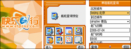 “快樂e行”預裝在手機中的存儲卡中,可直接安裝到手機的應用菜單欄里,點擊圖標,就可以直接進入首頁。圖形化的操作按鍵、簡明的文字提示、順暢的操作流程,人性化的設計讓機票預訂變得不再麻煩。