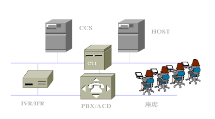 智能化網(wǎng)絡(luò)(Intelligent Network)、排隊(duì)機(jī)(ACD)、計(jì)算機(jī)語(yǔ)音集成(CTI)、自動(dòng)語(yǔ)音/傳真響應(yīng)設(shè)備(IVR/IFR)、業(yè)務(wù)系統(tǒng)主機(jī)HOST、座席(Agent)、信息板(Wall Boards)