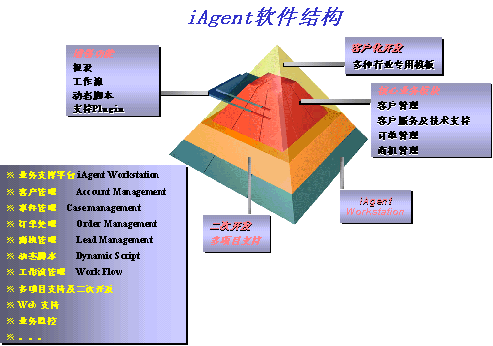 iAgent3.0從軟件內(nèi)部的結(jié)構(gòu)體系上加以突破,統(tǒng)一開放的應(yīng)用平臺(tái)上組合功能強(qiáng)大的二次開發(fā)工具,并在此基礎(chǔ)上加以針對(duì)行業(yè)而特別設(shè)計(jì)的功能模板。更好的適應(yīng)了企業(yè)處理流程的多樣化和需求的復(fù)雜化,并為企業(yè)高速的業(yè)務(wù)增長(zhǎng)和功能需求增長(zhǎng)帶來極大的拓展空間。軟件結(jié)構(gòu)如下圖所示: