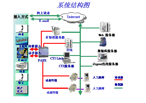 做為呼叫中心的業(yè)務(wù)管理核心,iAgent軟件和其相應(yīng)的硬件支持環(huán)境在呼叫中心系統(tǒng)結(jié)構(gòu)中占據(jù)重要的位置,iAgent全面功能實(shí)現(xiàn)依賴于整個(gè)系統(tǒng)的協(xié)同工作。
