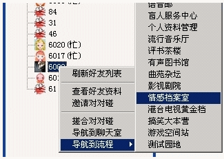 本功能對(duì)于主持人向新用戶介紹電話Q網(wǎng),留住新用戶特別有用。只要知道用戶想到哪個(gè)區(qū)域后,主持人直接點(diǎn)擊該用戶名即可以人工將用戶送到相應(yīng)區(qū)域,使用戶感受Q網(wǎng)的快捷樂(lè)趣。