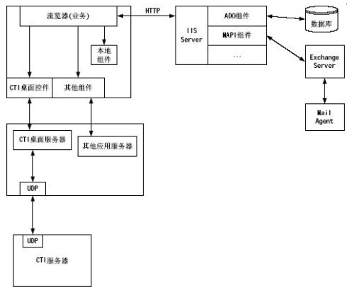 對于所有的電力業(yè)務(wù)模塊都是在IE瀏覽器上實現(xiàn),瀏覽器上的應(yīng)用模塊對WEB Server發(fā)出請求,WEB Server解釋運行ASP程序,利用ASP創(chuàng)建數(shù)據(jù)庫組件訪問系統(tǒng)的數(shù)據(jù)庫信息;利用嵌入WEB頁面的CTI桌面控件可以實現(xiàn)CTI集成功能,如:建立呼叫、應(yīng)答呼叫、席間轉(zhuǎn)移、人工自動切換等等;利用其他嵌入WEB網(wǎng)頁的組件實現(xiàn)其他擴展功能,如:Exchange