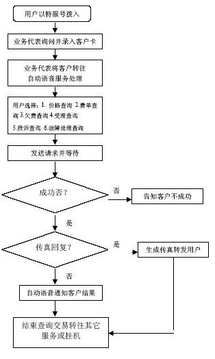 系統(tǒng)自動報受理人員工號,人工交互式受理方式。受理人員根據(jù)用戶要求從服務(wù)質(zhì)量標準數(shù)據(jù)庫、電費數(shù)據(jù)庫和其他相連的數(shù)據(jù)庫查詢資料,然后通過語音方式播報資料或送到用戶指定的傳真機或其他終端設(shè)備上。主要內(nèi)容如下:
