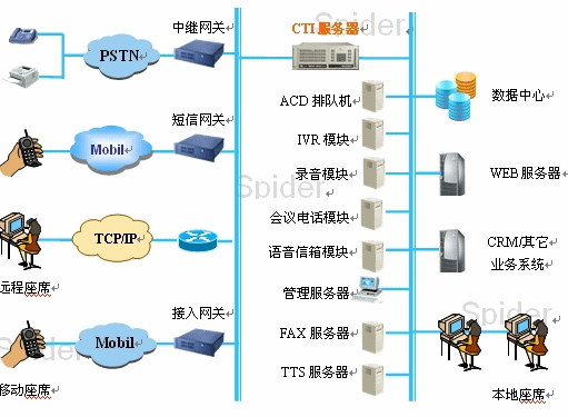 下面以思巴得公司的IP分布式呼叫中心為例,介紹新一代IP呼叫中心的網(wǎng)絡(luò)結(jié)構(gòu),如下圖所示: